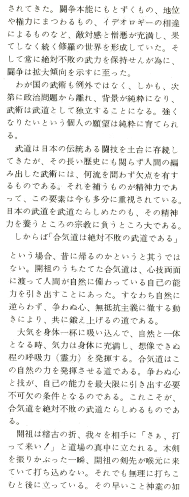 Le Fondateur, qui nous a quitté en 1969, a continué à présenter l'Aikdio au Dojo tout en faisant des développements ésotériques sur son art. Il s'est efforcé de démontrer que L'aikido est un art martial remarquable permettant d'éviter la défaite en toute circonstance. L'Aikido confère la force spirituelle nécessaire pour compenser les déficiences observées sur les arts martiaux dit incomplets. Ses techniques, en elles-mêmes, montrent que l'Aikido est le reflet d'un esprit sans conflits ni dissension. Le pouvoir de conviction de cet art est tel que même les personnes les plus réfractaires et sures d'elles-mêmes peuvent être impressionnées. Pour tout cela, l'Aikido mérite d''être désigné comme un "art invincible".