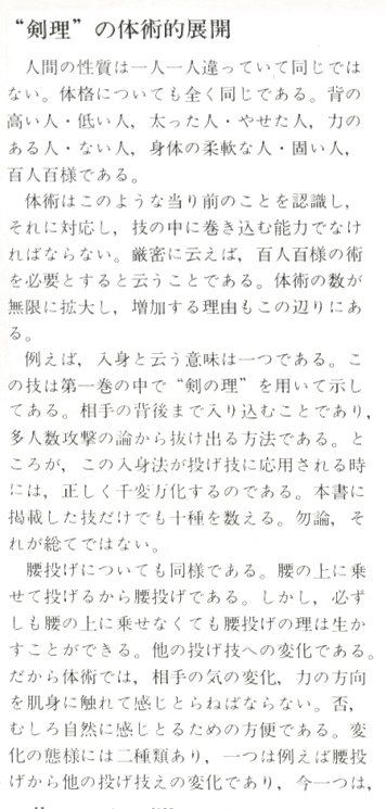 Taijutsu (Exercices à main nues) prennent en compte toutes ses variables et permettent de s'adapter aux différences de chacun. Plus exactement, Les techniques individualisées doivent être praticables pour autant de personnes que possible. Pour ces raisons, le nombre de techniques tend à croitre de façon indéfinie, en nombre et en portée.