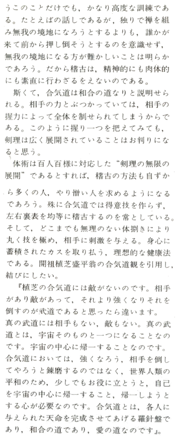 "Dans l'Aikido de Ueshiba, il n'y a pas d'ennemi. Il est faux de croire que le Budo est un moyen pour celui qui pratique de prendre le meilleur et les sensations d'un adversaire ou ennemi. Le véritable Budo ne considère pas l'autre comme un ennemi ou un adversaire. Le but véritable du Budo est de se mêler complètement avec l'énergie de l'univers. Ceci appelle en fait à retourner au centre de l'Univers pour former un tout. Dans l'Aïkido, le but de l'entrainement n'est pas de devenir plus fort et de battre son adversaire. Le pratiquant doit focaliser son esprit sur l'apprentissage pour un retour vers le centre de l'Univers, comme une entité intégrée avec comme objectif de partager la paix de l'humanité dans le monde. L’Aïkido est comme un compas donnant à chaque individu une direction pour l'accomplissement de sa vie, comme défini par l'esprit divin et permettant d'atteindre la paix, l'harmonie et suivre un chemin vers l'amour Divin."