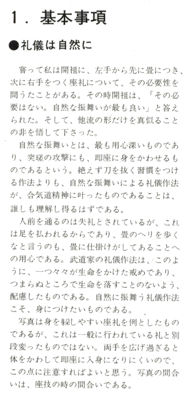 Une attitude naturelle est un état ou vous avez la plus grande d’attention et vous permet de rester l’esprit clair en cas d’attaque soudaine. Chacun doit comprendre qu’un comportement basé sur une attitude naturelle est plus en phase avec l’esprit de l’Aikido que ceux qui s’imprègnent de l’habitude de dégainer un sabre instantanément.