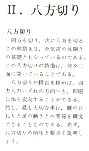 Cet exercice au ken présente les mouvements de coupe dans les quatre directions, suivi par les mouvements de coupe dans les huit directions. Ce sont les mouvements de base de l’Aikido. Happo-giri est caractérisé par des rotations avec un angle de 270 degrés. Si vous pratiquez suffisamment Happo-giri, vous pourrez positionner votre corps instantanément dans n'importe quelle direction. L’étude de cet exercice doit porter sur la relation entre les mouvements du corps et ceux des pieds.