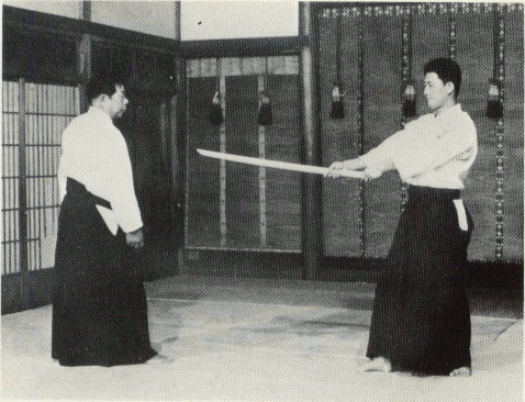 Agrippez le manche du Ken avec votre main droite. Placez votre pied droit derrière celui de votre adversaire et placez vos anches juste à côté de son corps. |