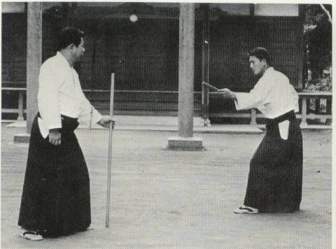 Katate toma uchi. (Placez le Jo derrière le cou, faites un pas en avant. Durant l’enjambée, frapper votre adversaire.) |