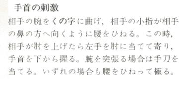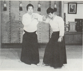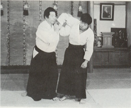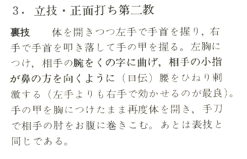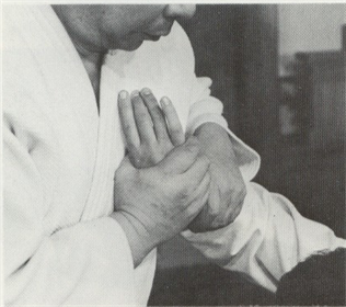 Ura-Waza techniques) : Après avoir tourné votre corps sur le revers, saisissez le poignet de votre adversaire avec votre main gauche, baissez le et agrippez l'arrière de sa main avec votre main droite. Relevez l'arrière de sa main sur la partie basse de votre revers et impulsez son poignet en pivotant vos hanches. "Pliez son bras en faisant une forme de <, comme pour faire tourner son petit doigt vers son nez" (Kunden) Pour avoir une bonne efficacité, votre main droite, est motrice dans l'application de la technique. Pendant que vous plantez l'arrière de la main de votre partenaire sur la partie basse de votre revers, tournez votre corps en biais à nouveau et envelopper son coude dans la zone basse de votre abdomen avec les Tegatana. Le reste de la technique et le même qu'en Omote Wasa.