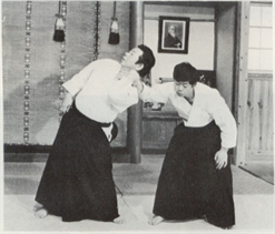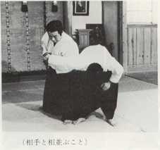 Omote Wasa (Technique de face) : Agrippez avec votre main droite les doigts de votre partenaire que vous avez capturé devant la partie basse de votre abdomen puis échangez votre prise avec la main gauche en vissant son poignet en direction de son aisselle. Il est très important à ce stade de la technique de déplacer votre pied gauche d'un pas en avant et "positionner votre corps à cote du sien" (Kuden)