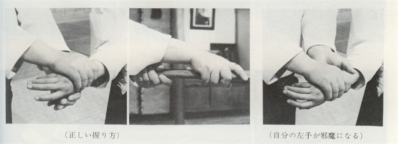 "Agrippez le poignet de votre partenaire de façon à ce que le côté du pouce de sa main soit dirigé devant vous." (Kuden)