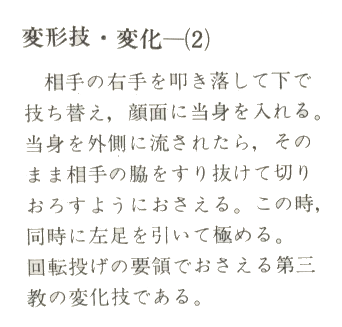 Changer la prise de main à un niveau bas et après avoir frappé vers le bas la main de votre adversaire et lui avoir délivré un Atemi sur son visage. Si l'Atemi est dévié vers l'extérieur; glissez et passez sur le côté de votre partenaire et clouez le au sol dans un mouvement de coupe. A ce moment, reculez votre pied gauche pour augmenter l'efficacité de cette technique. Il s'agit d'une variation de Dai-Sankyo qui se conclue à la manière de Kaiten-nage.