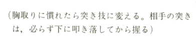 Dès que vous êtes à l'aise avec la technique Muna-dori essayez avec le Tsuki. Soyez sur de ne faire la saisie qu'après avoir frappé vers le bas le Tsuki de votre partenaire.