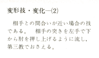 Cet exercice s'applique lorsque la distance entre vous et votre partenaire est courte. Déviez sa frappe en poussant son coude en avant avec votre main gauche et maîtriser vote partenaire avec Dai-Sankyo