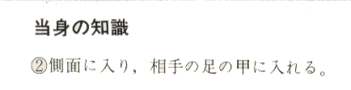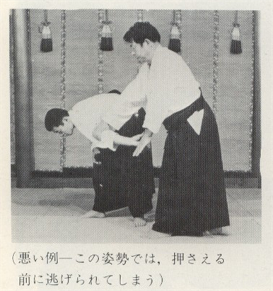 Effectuez un mouvement d'épaule comme si vous effectuez un mouvement de coupe, de telle façon que votre corps se désengage de la prise de votre partenaire et clouez-le au sol avec Dai-Ikkyo Omote-wasa. Lorsque vous tirez votre pied en arrière au moment du désengagement, tournez vos hanches et restez contre le corps de votre partenaire.