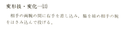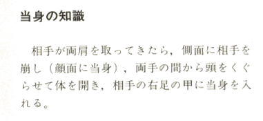 Lorsque votre partenaire essaye de vous saisir par les épaules, déséquilibrez-le sur le côté (en effectuant un Atemi sur le visage), glissez votre tête entre ses bras et en passant par le côté puis placez votre corps en biais puis faite un Atemi sur son coup-de-pied.