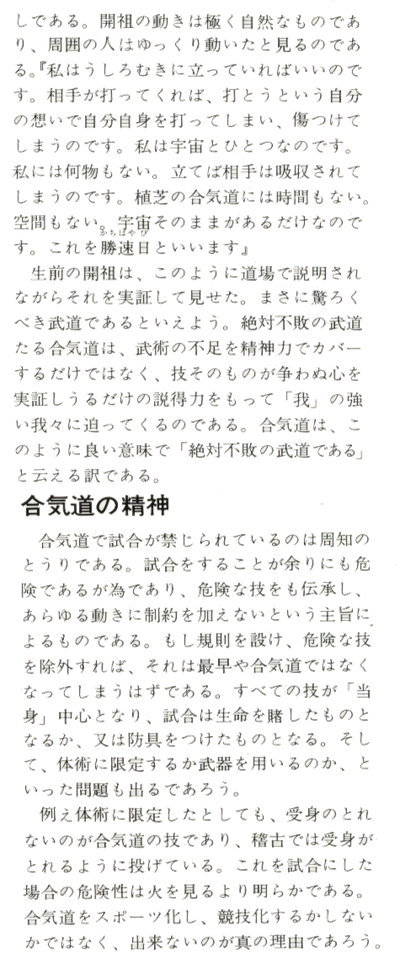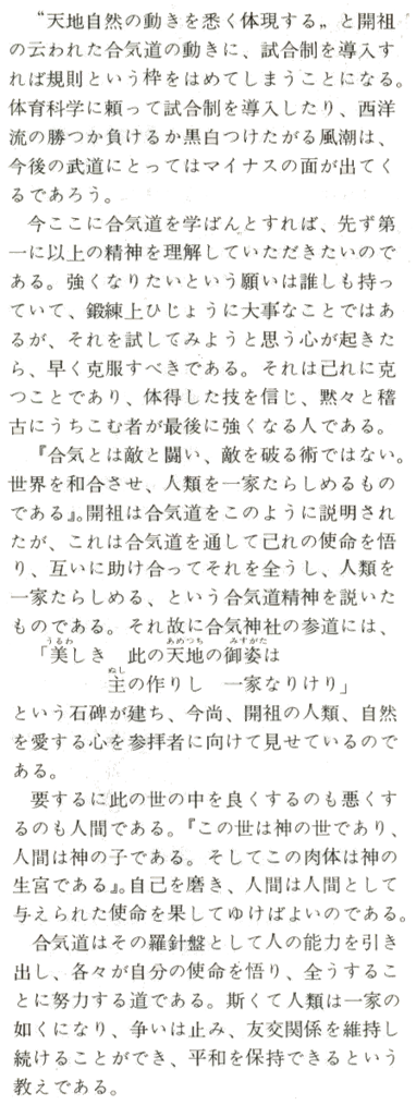 Le Fondateur décris les mouvements de l'Aikido comme la "matérialisation dans les moindres détails des gestes du Ciel, la Terre et autres formes de la Grande Nature". Si un mode de compétition est introduit dans l'exercice de l'art de L'Aikido, les techniques seront nécessairement restreintes par un cadre réglementaire très précis. Procéder de cette façon en introduisant les notions de gymnastique et la tendance occidentale de croire en la "victoire ou défaite" hypothèquera l'avenir de cet art sur bien des aspects.