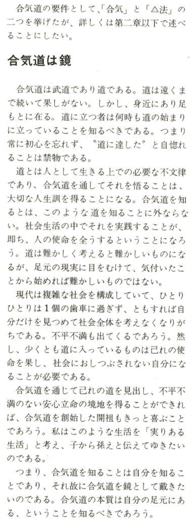 L‘aikido est un art martial qui est en quête de vérité. Le chemin vers la vérité est interminable. Paradoxalement, la vérité n’est pas si éloignée. Elle est juste « sous vos pieds ». Ceux qui cherchent la vérité doivent savoir qu’ils sont toujours au début de leurs efforts. En d’autres mots, ils doivent toujours garder à l’esprit la modestie et le comportement des débutants qu’ils ont été et réfréner le sentiment d’autosuffisance d’avoir atteint la fin de leur quête.