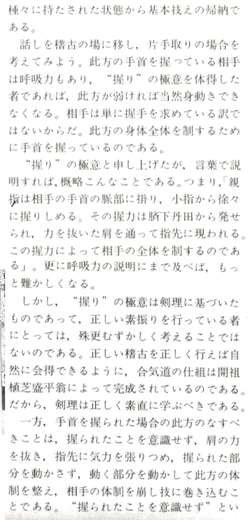 Que devez-vous faire lorsque votre adversaire vous prend le poignet en utilisant une technique de saisie? Ne vous focalisez surtout pas sur la partie de votre corps qui est saisie. Comportez-vous comme si rien ne s'était passé. Relâchez vos épaules et chargez l'extrémité de vos doigts avec votre énergie. Ne cherchez pas à bouger le poignet qui est saisi, déplacer simplement les parties de votre corps et aligner votre posture de telle façon que votre adversaire perde son équilibre et qu'il puisse subir n'importe laquelle des techniques que vous voulez appliquer. Rester impassible dans ces moments nécessite beaucoup d'entrainement. D'une certaine façon vous trouverez peut être plus difficile, alors que vous êtes en position de méditation, que quelqu'un vous pousse vers le sol pour qu'ensuite vous vous releviez toujours en restant dans ce même état, calme et imperturbable. Lorsque que vous étudiez l'Aikido, vous devez entièrement vous consacrer à l'entrainement et à l'attente d'un état d'esprit indispensable pour la maîtrise de cet art.