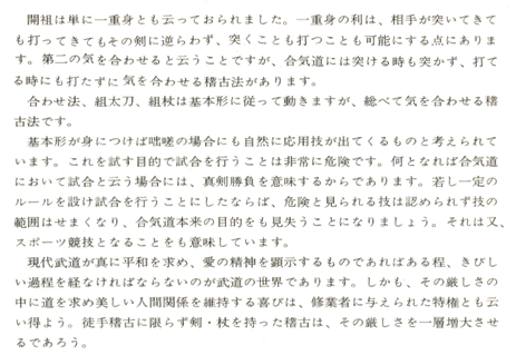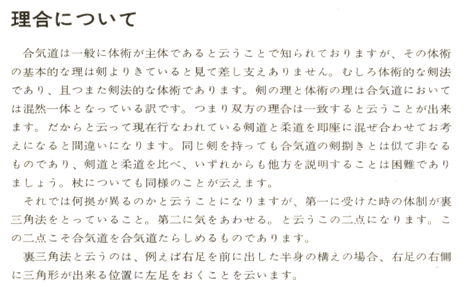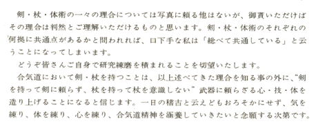 Pour comprendre le système de l'Aïkido il faut réaliser que l'on n'est pas tributaire d'un Ken, ou Jo ou d’une autre arme. Le développement de l'esprit, le corps et les techniques ne se fonde pas sur une arme, mais sur l'indépendance d'action. Si une épée est utilisée, ne la considérez pas comme une épée. Si vous utilisez un Jo, ne dépendez pas de lui, mais sentez l'harmonie en mouvement.