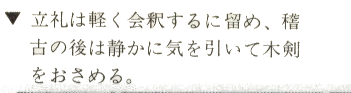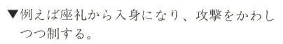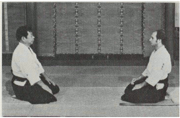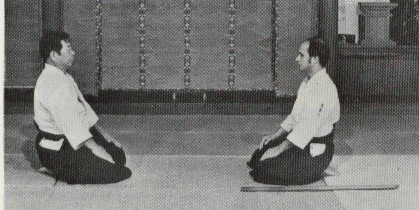 Les photos montrent un exemple de position assise qui permettent d’esquiver facilement une attaque. La position pour saluer est différente de celle pratiquée normalement. Une attention doit être portée sur la position des mains, qui ne doivent pas être trop éloignées, de façon à ce que le déplacement du corps ne soit pas trop difficile et vous permette de faire les techniques d’entrée immédiatement. La posture mutuelle montrée dans les photos est celle à suivre dans les exercices à genoux.