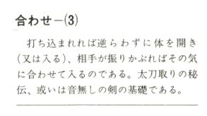 Lorsque votre adversaire effectue sa coupe, tournez vos anches et faites glissez votre corps en dehors de la ligne d'attaque ou en faisant un pas en arrière. Lorsque votre adversaire relève à nouveau son arme pour frapper, avancez d'un pas en vous mêlant à son flux de Ki. C'est le secret du "Tachi Dori", ou le désarmement, et les bases du "Otonashi-no-ken", la lame silencieuse.