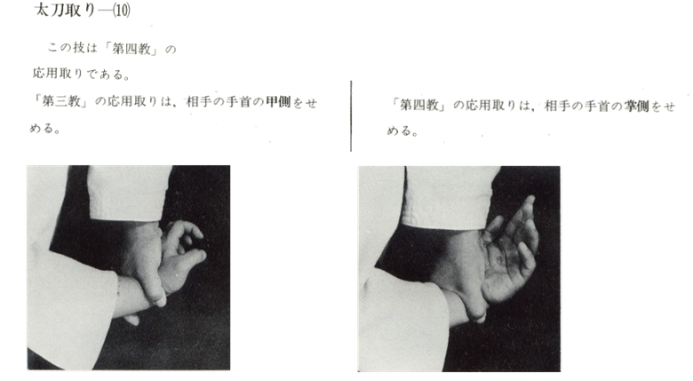 Dans les techniques appliquées de Yonkyö, le poignet de l'opposant est saisi par le devant de la main.