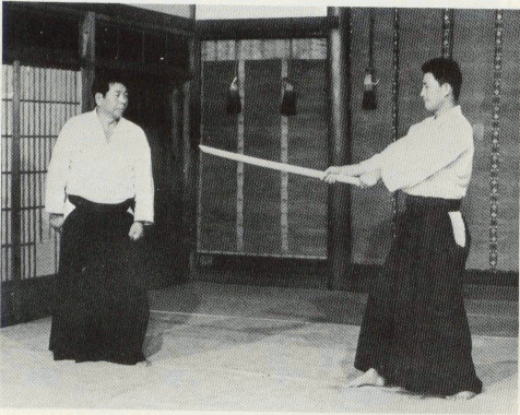 Mêlez-vous au mouvement de votre opposant lorsqu'il lève son Ken et entrez avec le pied gauche. (Notez la position de la main droite) Agrippez son col avec votre main gauche. |