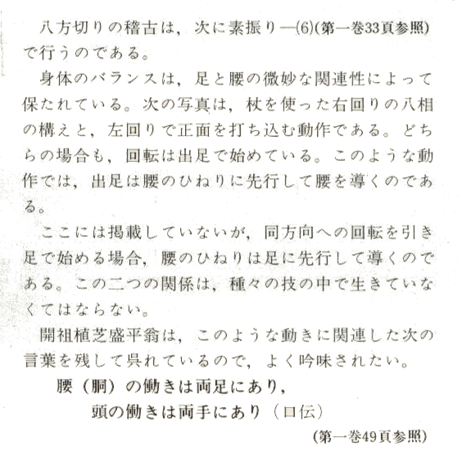 Le corps est en équilibre grace à la relation subtile entre les pieds et les anches. Les photos suivantes montrent le Jo dans une position de Hasso après avoir fait une rotation sur la droite une frappe sur l'avant et un mouvement de rotation à gauche. Dans les deux cas, la rotation démarre par les pieds. Dans les mouvements de ce type, les pieds guident les anches au départ de l'action.