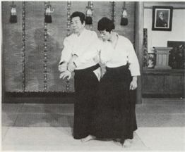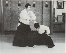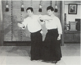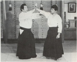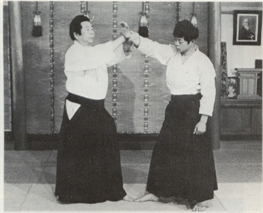 Ura-Waza techniques) : Après avoir tourné votre corps sur le revers, saisissez le poignet de votre adversaire avec votre main gauche, baissez le et agrippez l'arrière de sa main avec votre main droite. Relevez l'arrière de sa main sur la partie basse de votre revers et impulsez son poignet en pivotant vos hanches. "Pliez son bras en faisant une forme de <, comme pour faire tourner son petit doigt vers son nez" (Kunden) Pour avoir une bonne efficacité, votre main droite, est motrice dans l'application de la technique. Pendant que vous plantez l'arrière de la main de votre partenaire sur la partie basse de votre revers, tournez votre corps en biais à nouveau et envelopper son coude dans la zone basse de votre abdomen avec les Tegatana. Le reste de la technique et le même qu'en Omote Wasa.