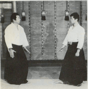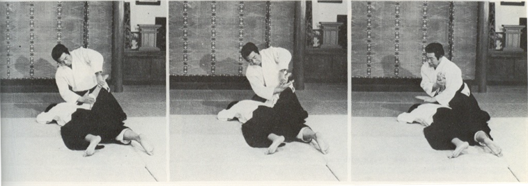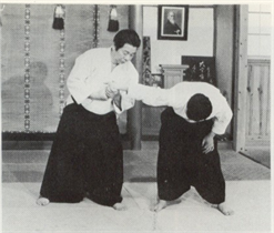 Omote Wasa (Technique de face) : Agrippez avec votre main droite les doigts de votre partenaire que vous avez capturé devant la partie basse de votre abdomen puis échangez votre prise avec la main gauche en vissant son poignet en direction de son aisselle. Il est très important à ce stade de la technique de déplacer votre pied gauche d'un pas en avant et "positionner votre corps à cote du sien" (Kuden)