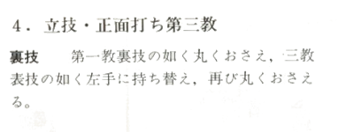 Ura-Waza (Technique en torsion) : Bloquez votre partenaire en faisant un mouvement circulaire en suivant le schéma de Dai-Ikkyo Ura-Wasa, échangez la prise comme pour Dai-Sankyo Omote Wasa, et amenez le vers le bas dans un mouvement circulaire.
