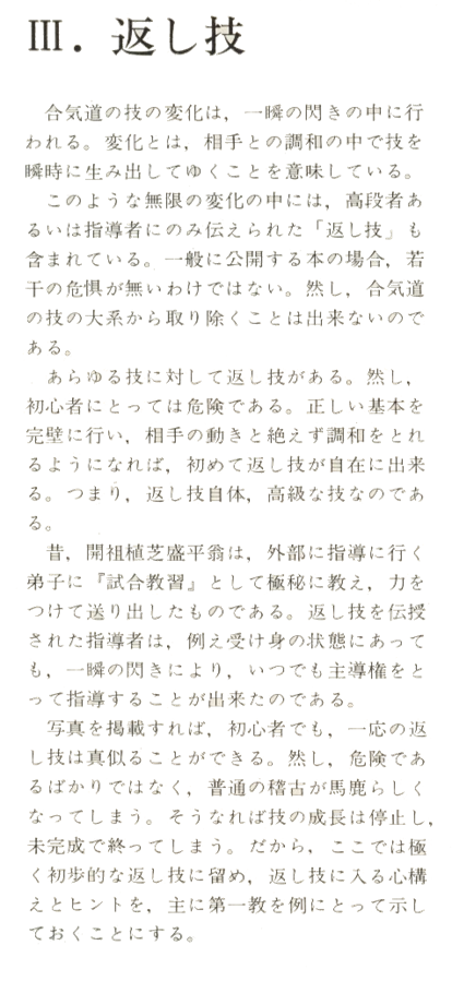 Si vous étudiez les séries de photos de Kaeshi-waza, même un débutant sera capable d'imiter les techniques jusqu'à un certain stade. Dans tous les cas, ce n'est pas seulement dangereux mais cela peut faire perdre de vue au débutant l'importance d'un entrainement sans chercher à utiliser ces techniques. Si tel est le cas, sa progression dans la maîtrise de l'Aikido sera stoppée et il gardera pour toujours un sentiment d'insatisfaction. Pour ces raisons, la discussion est limitée aux techniques élémentaires de Kaeshi-waza. Les attitudes et les explications concernant Kaeshi-waza sont mises en lumière dans cette section, principalement en utilisant Dai-Ikkyo comme exemple.